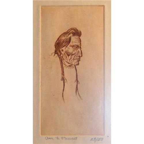 Ace Powell etching of Native American. Signed at bottom and numbered 23/50. Image size is 6'' x 3''