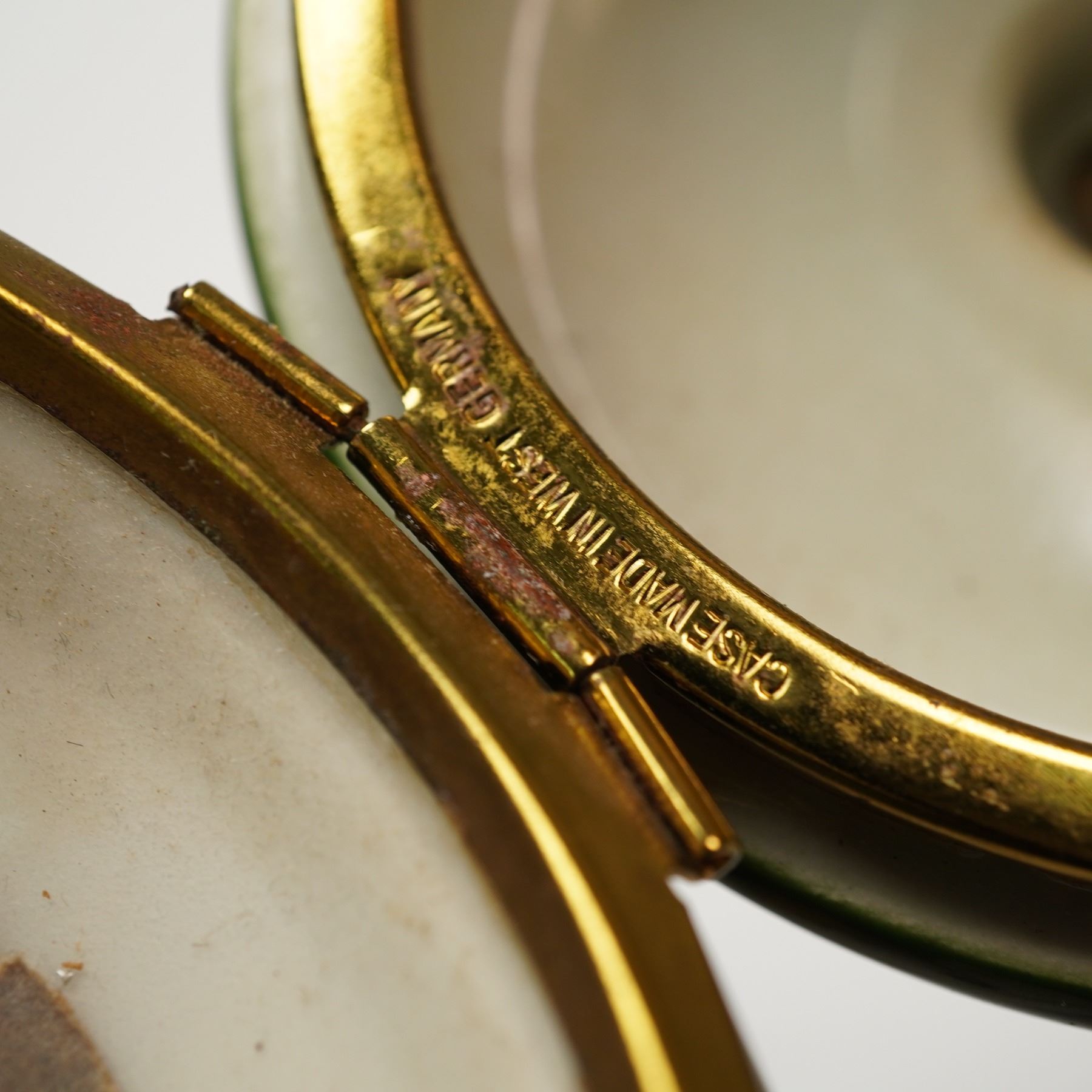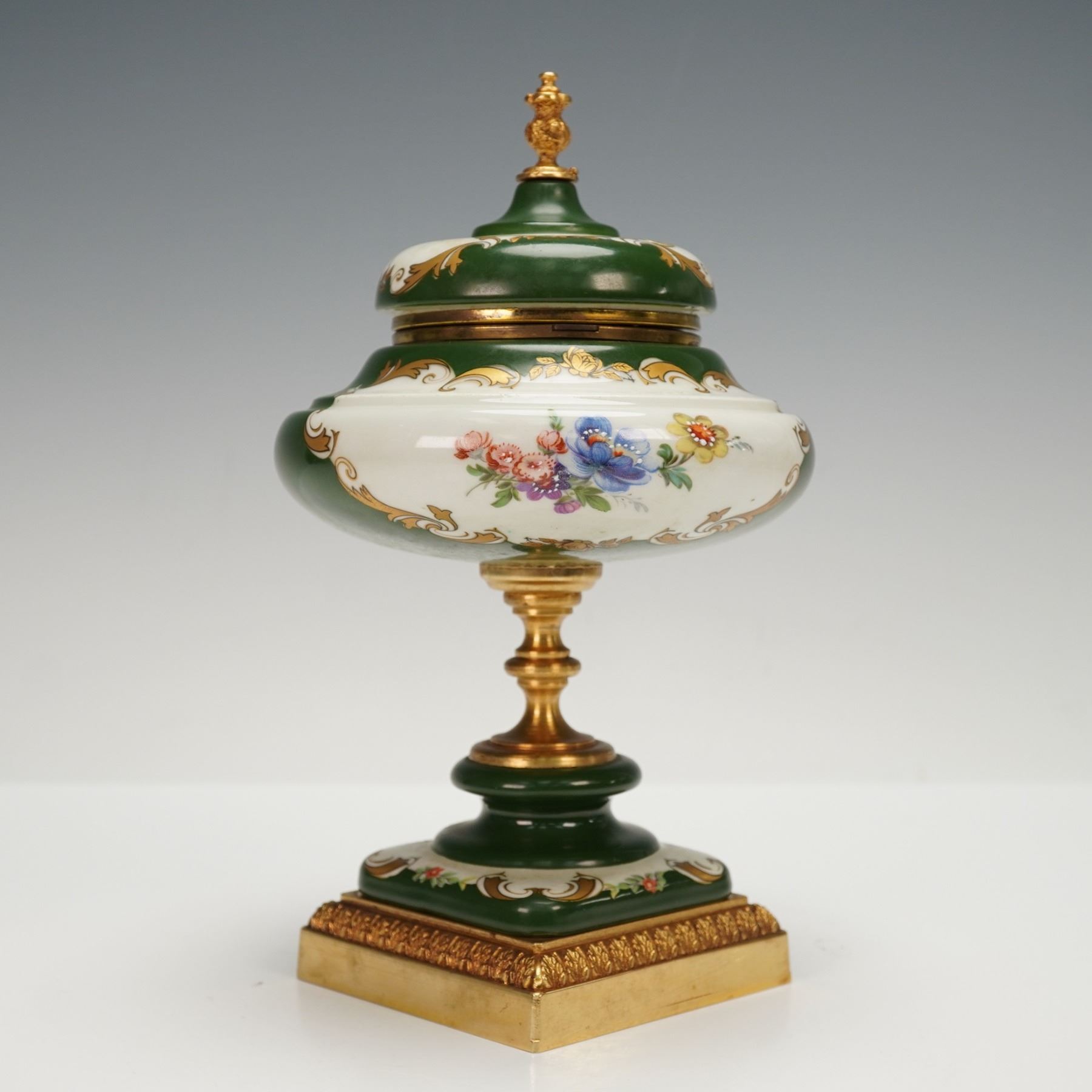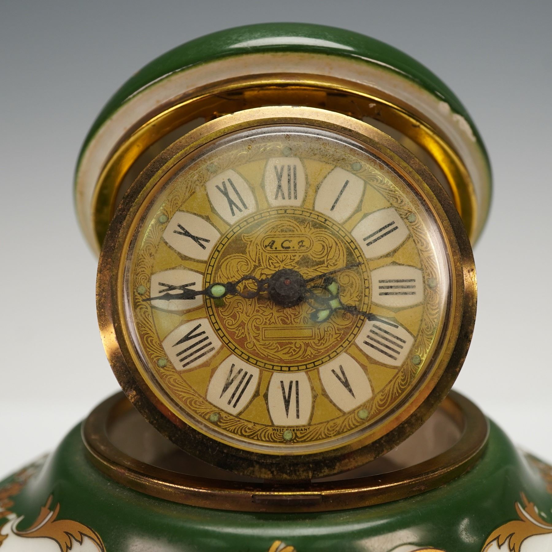A porcelain and gilt metal pedestal clock featuring a hinged lidded case adorned with hand-painted floral motifs, framed by scrolling gilt accents on a green and white ground. The domed lid opens to reveal a circular clock face with Roman numerals, ornate filigree detailing, and the mark "A.C.F." on the dial. The mechanism is marked "West Germany," and the inner rim bears the inscription "Case Made in West Germany." The timepiece rests upon a gilt metal-mounted porcelain base with a square plinth decorated with gilt foliate trim.