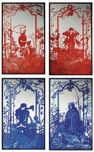 ACID ETCHED CAMEO WINDOWS. Spectacular set of four acid cut cameo windows depict the four stages of a woman's life. The first window done in red cut to frosted clear shows a stork holding a basket in it's mouth with baby in the basket. Young children stand before the stork amongst finely detailed flowers and foliage. Within the undercover, are small animals and toys. The second stage in red cut to frosted clear depicts a young woman in flowing gown walking under an archway of roses with a heart hanging above. The detailed foreground depicts lovely foliage partially concealing a jewel chest. Small animals hide in the underbrush and a pair of lovebirds are perched on a limb. The third stage in blue cut to frosted clear depicts a mother with young child again beautifully detailed flowers and foliage surround the scene and reveal cats and kittens playing in the grass in front of the child while birds fly in upper corner of window. The final stage in blue cut to frosted clear depicts an elderly woman in hooded cape walking with cane through winter scene of barren branches and snow on the ground. A wise owl reads a book in one corner while a raven rests on a branch in the opposite corner. SIZE: 20 in. x 34 in. each. CONDITION: Very good to excellent. 5-61264