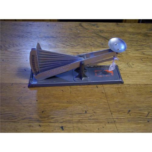 Nice ACME egg scale.The label that was on the flat front piece is mostly gone,but all the writing is engraved in the side piece.I can never keep these in stock.They sell about as fast as I can find them.