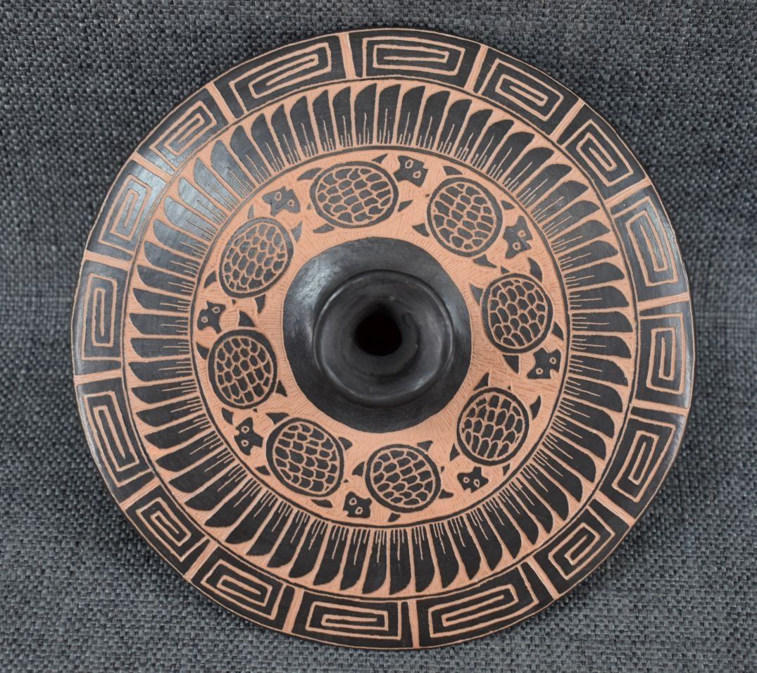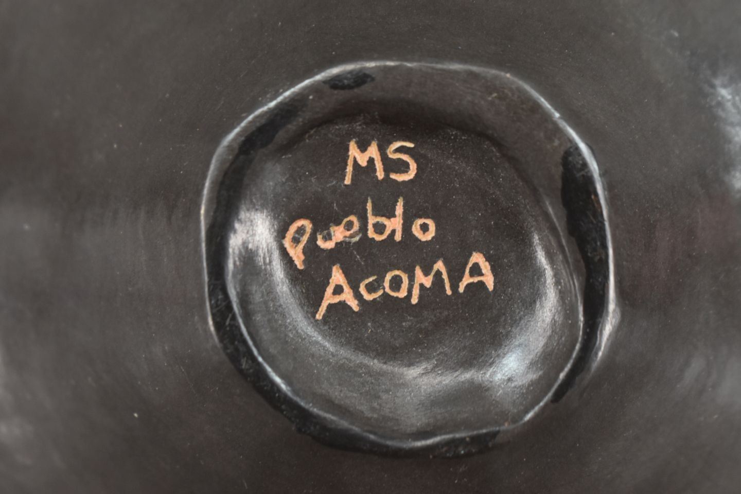 contemporary Acoma Indian ceramic vase with sgraffito geometric feather and turtle design signed MS 4" x 7.25"