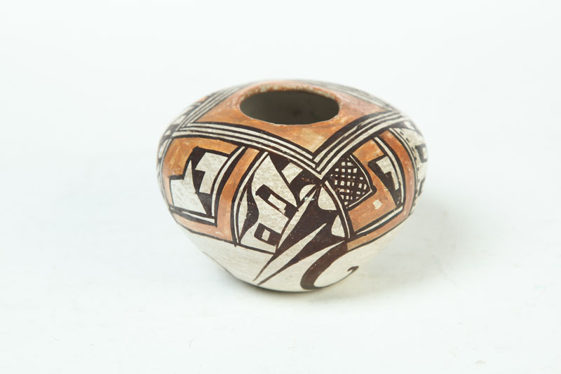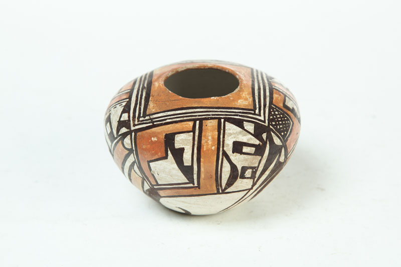 New Mexico, ca.1925, ceramic. Used to store melon, pumpkin, sunflower, and bean seeds until planting time. Early survivors like this example are uncommon. 3"h. 4 1/4"dia. Ex Steve Elmore (New Mexico).