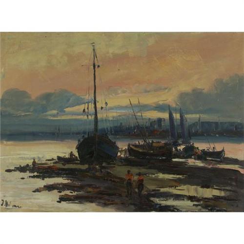 ACRYLIC ON CANVAS 20'' x 28'', Indistinct signature. Harbor Scene at Sunset. Mid-20th century. Signed lower left. Placed in a simple wood frame with beige fabric matting and white trim.