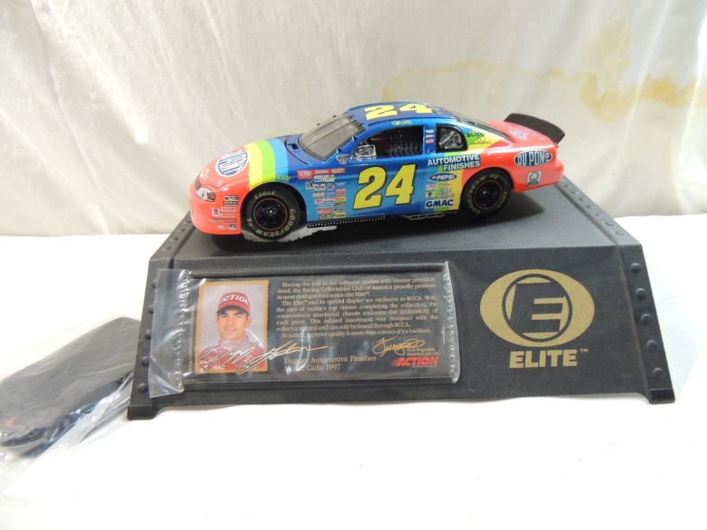 1:24 SCALE RACING ACTION COLLECTIBLE. LIMITED EDITION. HAND CRAFTED. STOCK CAR MODEL NASCAR COLLECTIBLE. MOTORSPORTS COLLECTIBLES, WITH ORIGINAL BOX, SPECIAL ELITE DISPLAY STAND INCLUDED AS SHOWN SEE PHOTO FOR MORE DETAILS.
