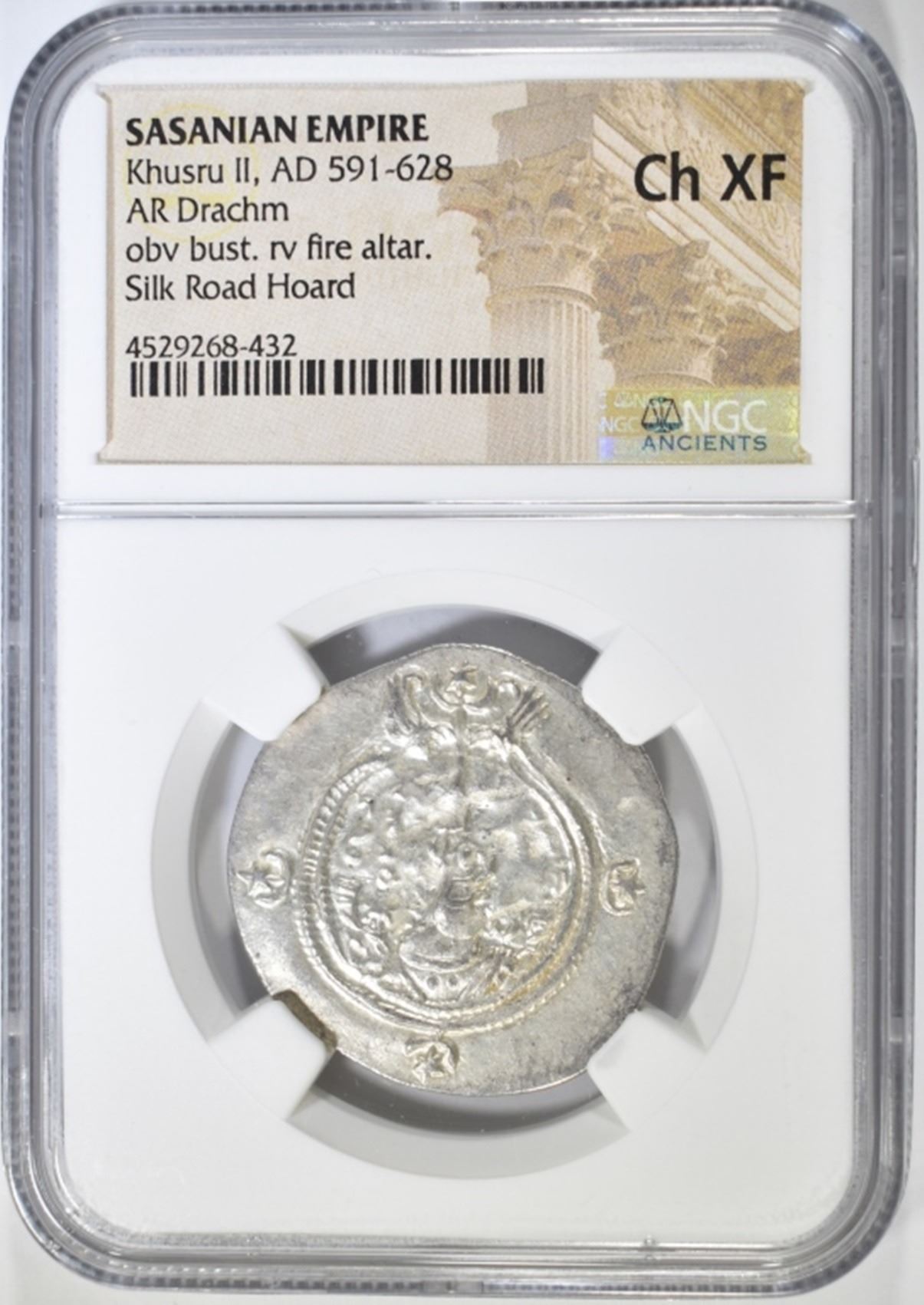 AD 591-628 KHUSRU II, AR DRACHM NGC CH XF