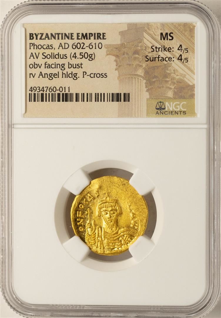One AD 602-610 Phocas Byzantine Empire Solidus Ancient Gold Coin NGC MS. NGC Certified.
