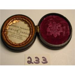 2 1/8" by 1 7/8" oval Daguerreotype, Tin type Photo Case. By Littlefield, Parsons & Co., paperwork still intact advertises it as "with embracing, riveted hinges". Pat Oct 14,1856 & April 21, 1857. Has velvet lining. Exc Cond