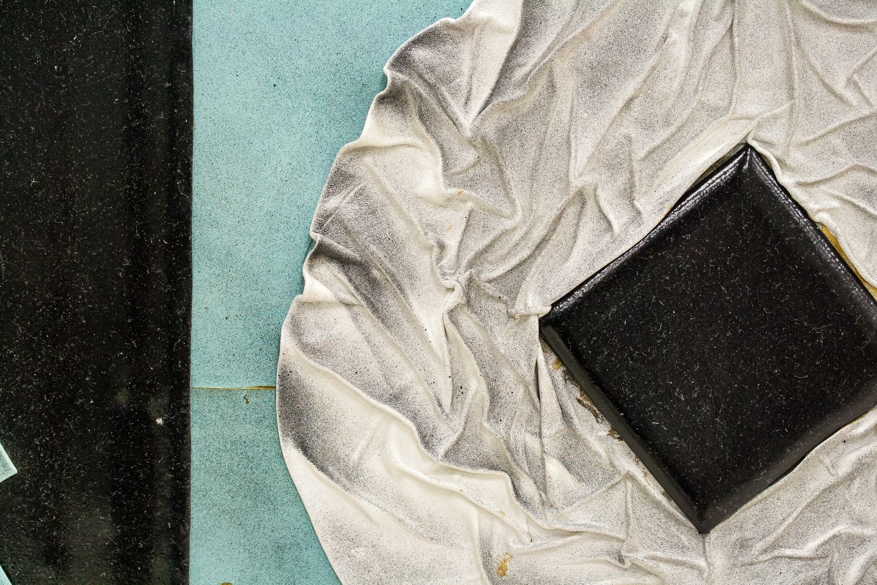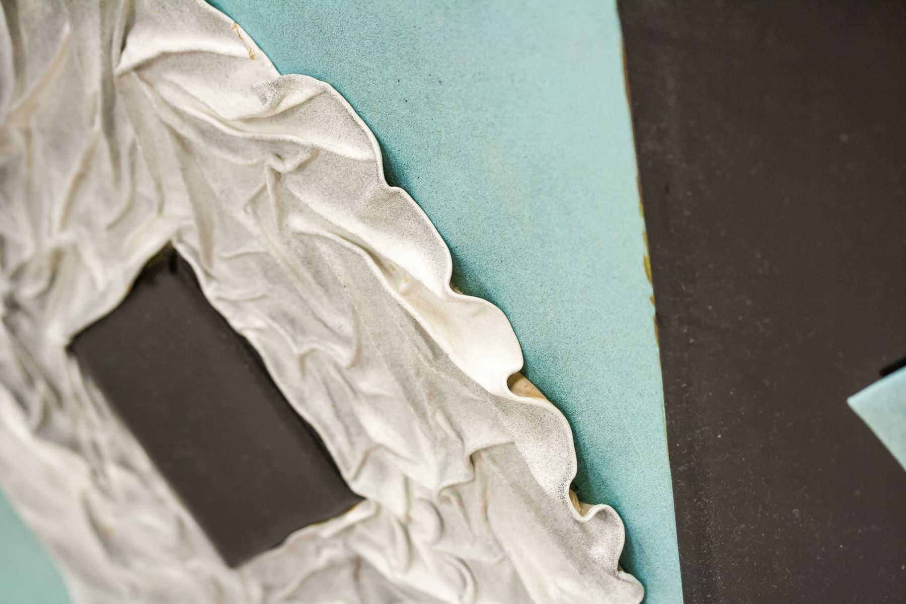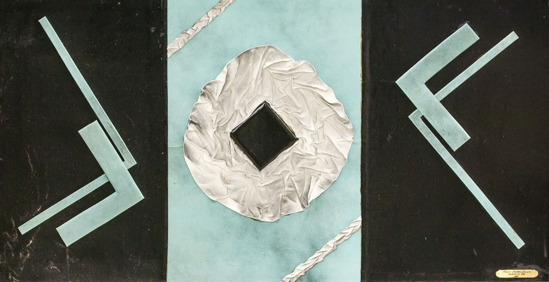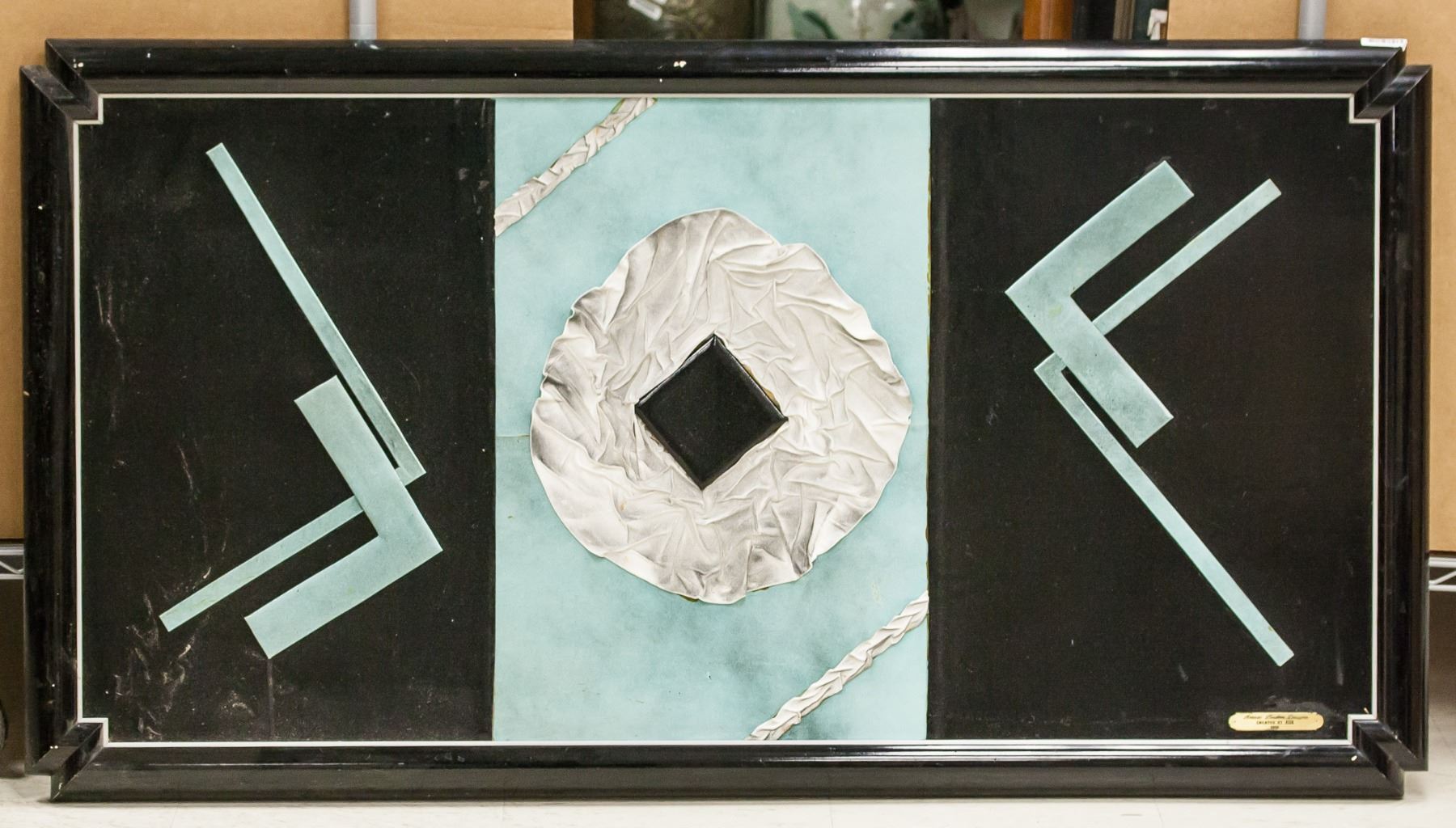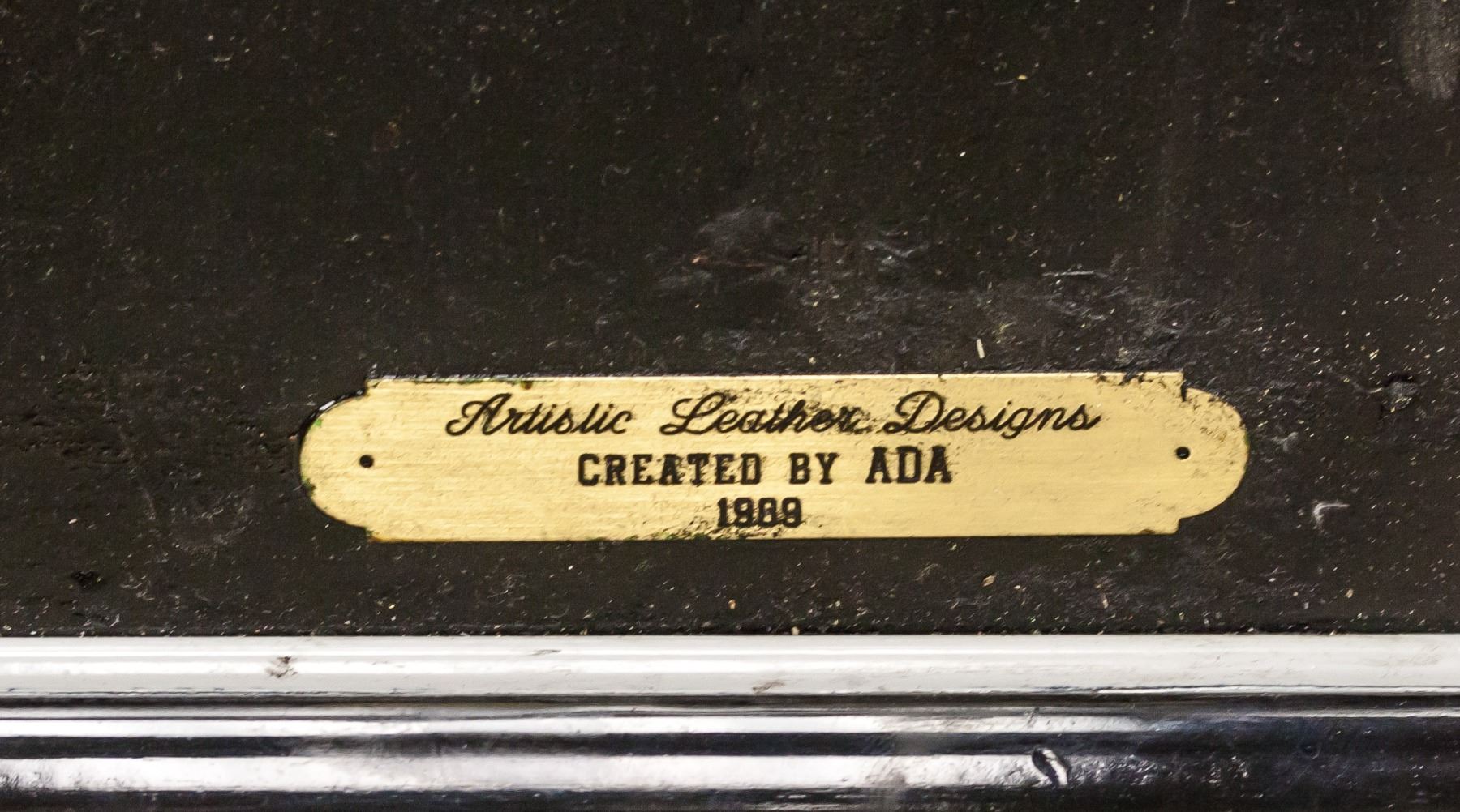 Leather work abstract composition. Plaque on the bottom inscribed "Artistic Leather Designs / Created by ADA / 1989. 60 x 120 cm (23.5 x 45 inches), Frame: 70 x 133 cm (27.5 x 52.25 inches). Provenance: Toronto estate
