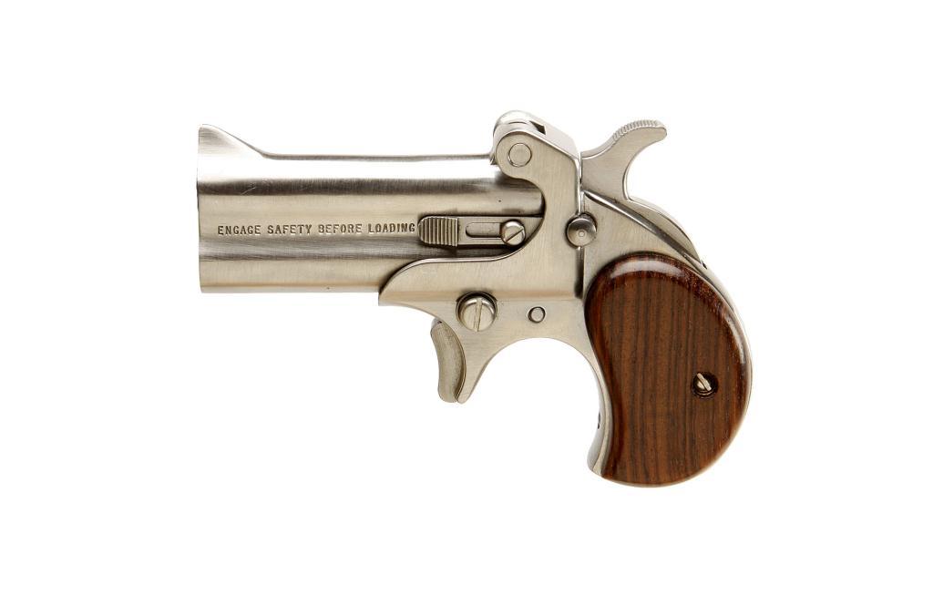ADC Derringer Cal .45LC/.410 2 1/2" SN:44201 Personal protection pocket derringer in .45 Colt or .410 shot shells 2 1/2". Stainless steel construction, smooth wood grips, 3" barrels with fixed sights, good bores and action.