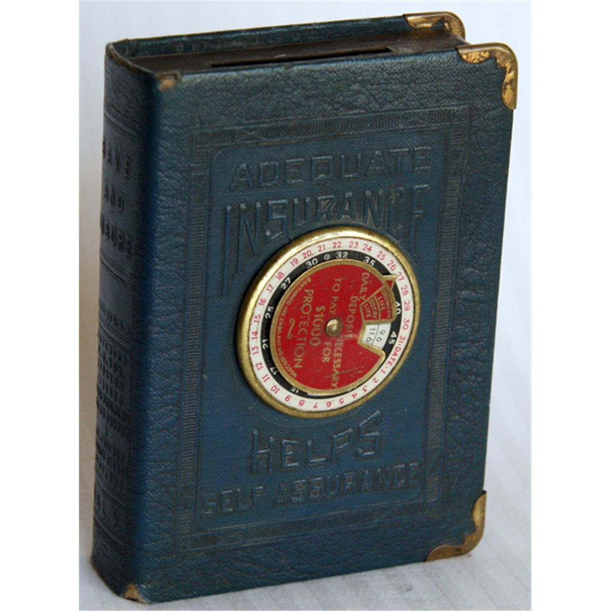 ADEQUATE INSURANCE HELPS SELF ASSURANCE, on front. ‘MUTUAL RELIEF LIFE INSURANCE CO, Sherbrooke, Que., on back. No serial number or patent information. Key lock. No key present. Date wheel on front. ‘Save & Insure’ on spine. 11cm x 2cm x 8cm. Dark brown cloth or leatherette cover. Unknown maker. Dial on front. F/VF.