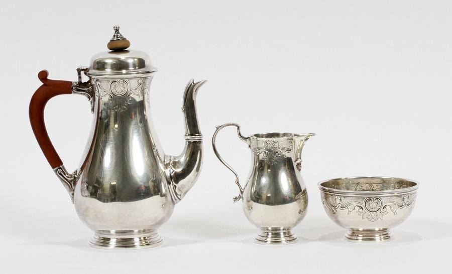 Coffee pot, creamer and sugar. Coffee pot 7". Impressed date mark "N", lion passant, anchor, Adie trade mark.