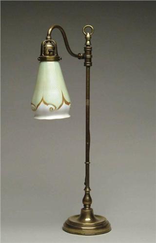 ADJUSTABLE DESK LAMP. Nice adjustable height desk lamp has brass foot and upright on which an extension arm moves up and down for variable height light. Lamp is finished with a beautiful Fostoria hooked shade with green hooked feather against a white background and gold iridescent trim. SIZE: Shade is 7-1/4" t. Overall height is lamp is 26". CONDITION: Very good to excellent. 5-61879