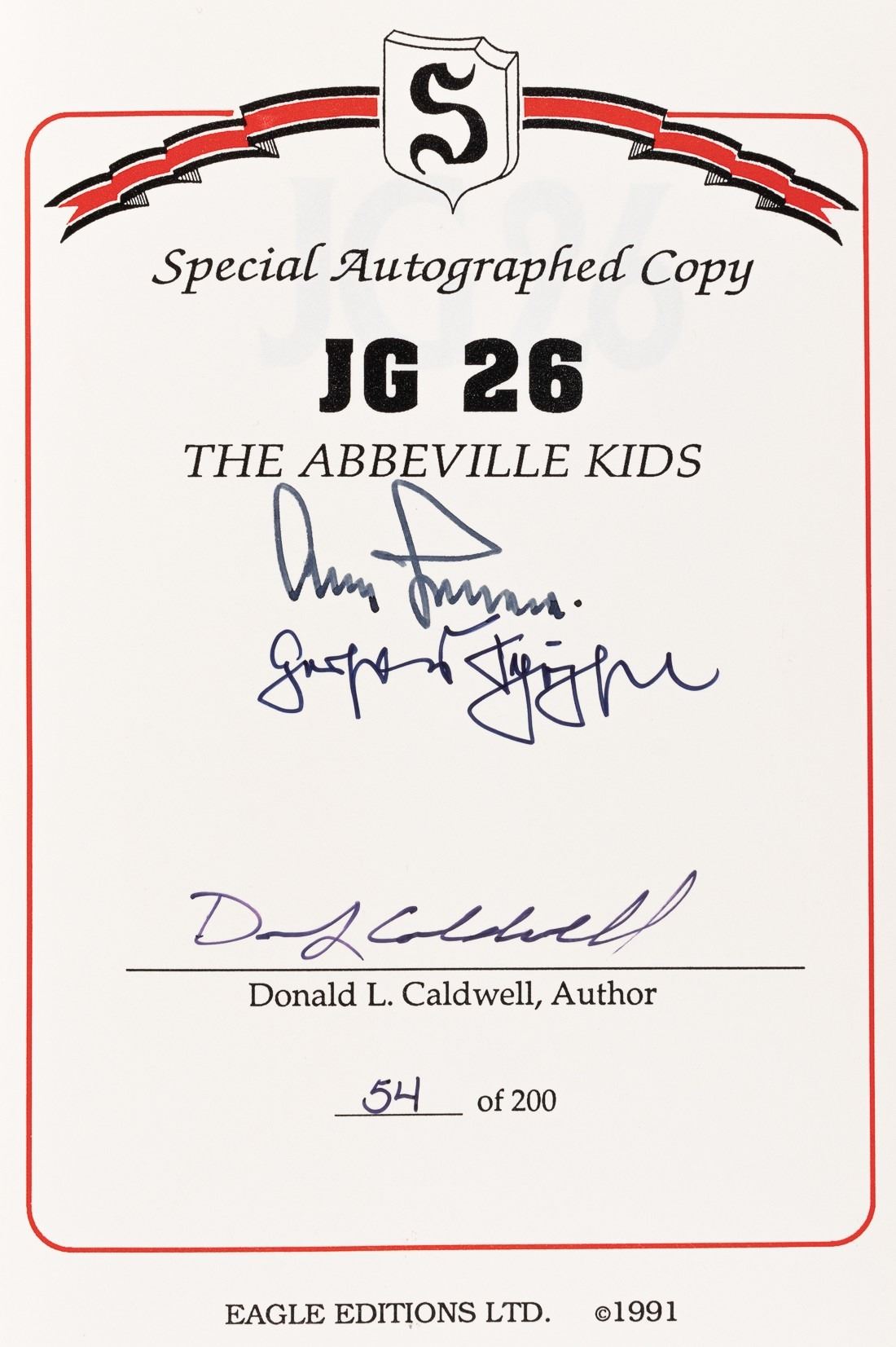 (1912-1996) German Luftwaffe General and a flying ace credited with 104 aerial victories. Special autographed copy number 54 of 200 of 'JG 26: Top Guns of the Luftwaffe', written by Donald L. Caldwell, 1991, 440 pages, hardback, Special Autographed Copy 54/200, signed bookplate, 9 x 6.5 inches.