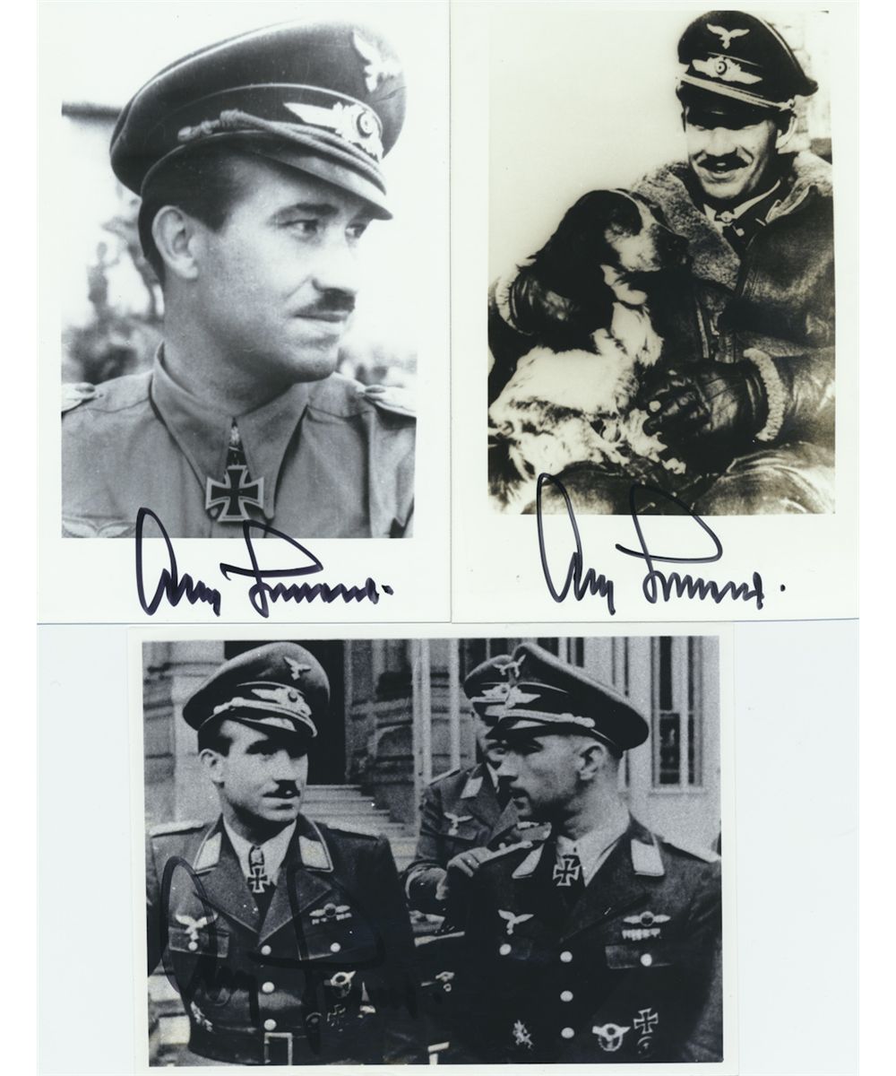 (1911 - 1994) German fighter ace of World War II and general of fighters. Holder of the Knights Cross with Oak Leaves, Swords and Diamonds. A group of three 4" x 6" b/w reproductions of vintage images of Galland in uniform, each boldly signed in black marker. One image has poor contrast, the others are very good.
