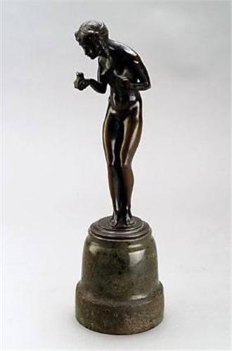 Froschkönig,<BR> Bronze, Marmor. Auf einem Marmorsockel ein stehender weiblicher Akt, in der rechten Hand einen Frosch mit Krone, die mit einem Schmuckstein verziert ist, haltend. H.: 33,5 cm. Bez.: Künstlersign. auf der Plinthe A. DAUMILLER.<BR>