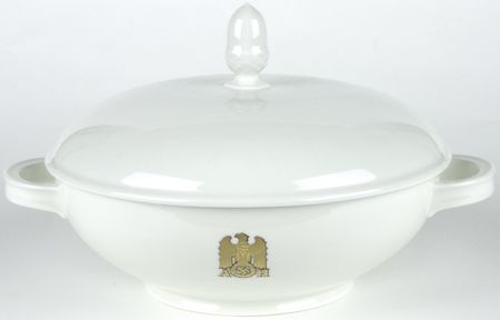 A rare piece of Allach porcelain dinnerware manufactured exclusively for Adolf Hitler in the SS-operated Allach porcelain factory at the notorious concentration camp at Dachau. This set measures 8" diameter, with a gold Nazi eagle on the side and an 3-D acorn as the handle. Hallmarked on the bottom with the green Allach SS stamp. In fine condition.