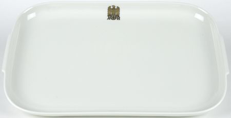 A rare piece of Allach porcelain dinnerware manufactured exclusively for Adolf Hitler in the SS-operated Allach porcelain factory at the notorious concentration camp at Dachau. This rectangular serving platter measures 15" x 9" x 1 1/4" deep. It is accented with a gold-embossed Nazi eagle device and hallmarked for Allach on the bottom. Fine condition.