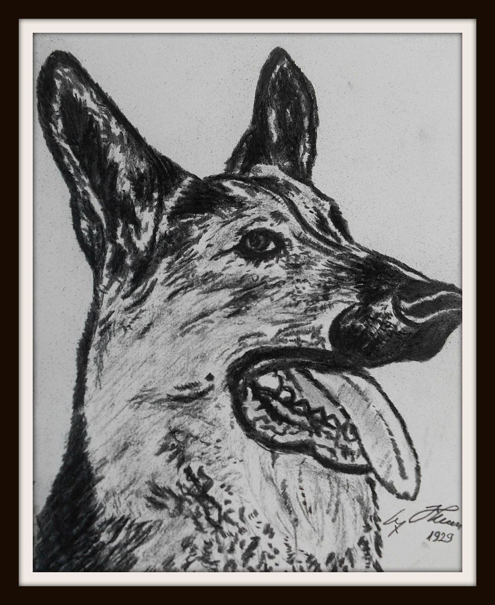A drawing by Adolf Hitler probably of Blonda who was born in 1926. Additionally signed by Hitler and dated. Professionally mounted and framed in wood. Before the famous Blondi, Hitler owned two German Shepherd bitches, both called Blonda. The original Blonda was born in 1926, and was the mother of the second Blonda, who was born during 1930.