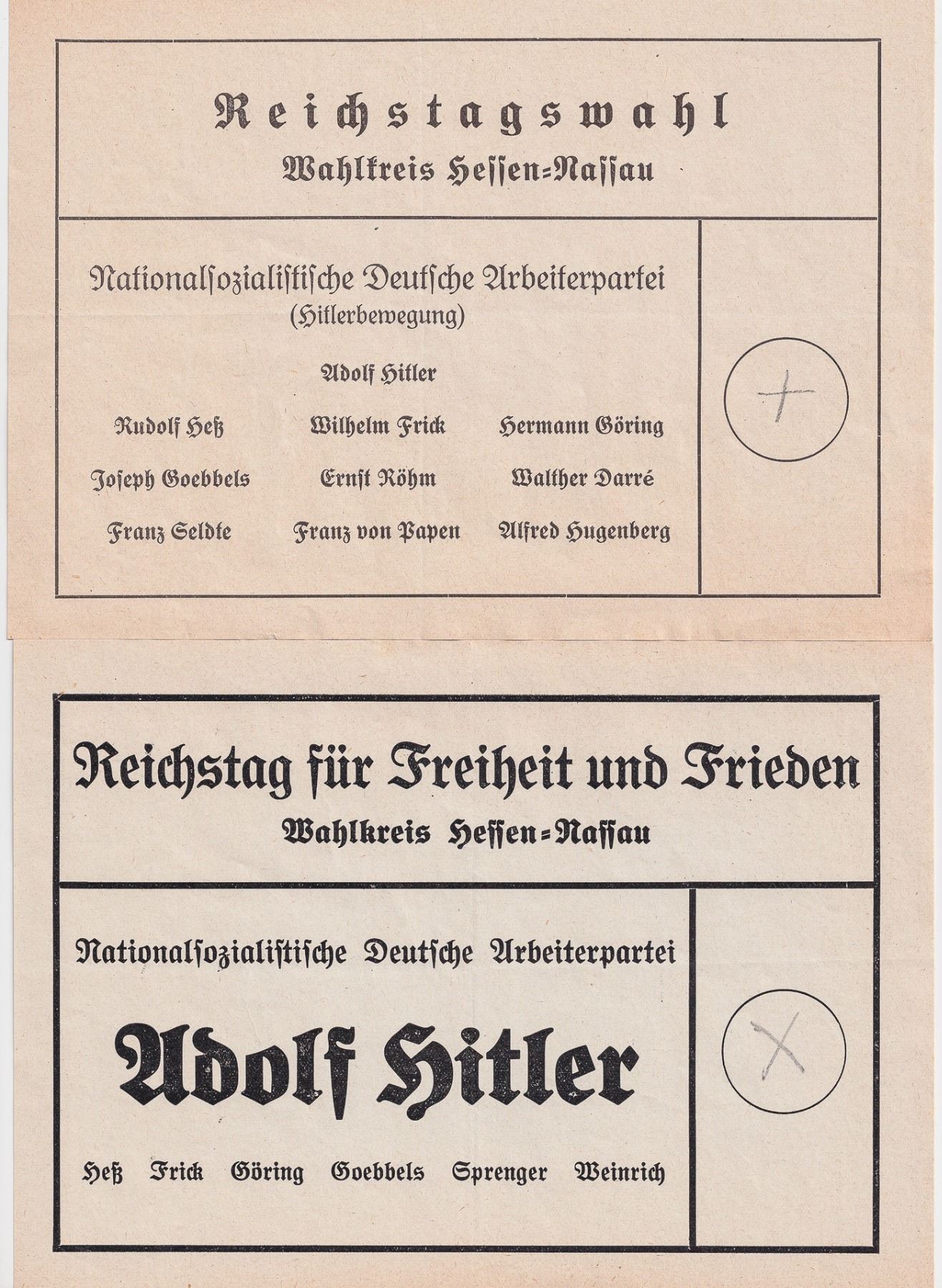 Two German Reichstag election ballots for the constituency 'Wahlkreis' of Hessen-Nassau (Hesse-Nassau) for the NSDAP listing candidates Adolf Hitler, Rudolf Hess, Wilhelm Frick, Hermann Goering, Joseph Goebbels, Jakob Sprenger, Karl Weinrich, Ernst Rohm, Walther Darre, Franz Seldte, Franz von Papen, and Alfred Hugenberg. Ballots from 1933 and 1936, marked. Approx. 6 x 8 inches.