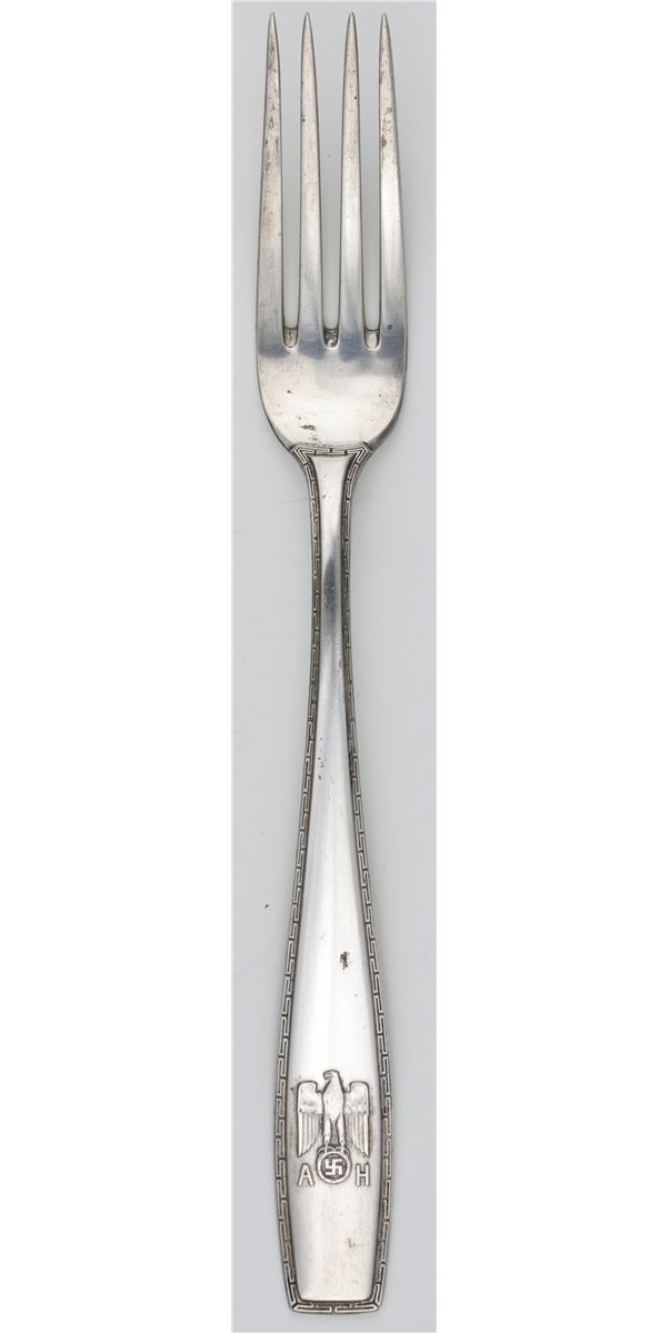 Scarce fork from Adolf Hitler's formal pattern of silverware, 8 1/4" long with four tines, bears the appropriate hallmarks and Hitler's personal monogrammed eagle and swastika with the edge of the fork in a Greek key pattern. An increasingly rare piece to locate, in fine condition.