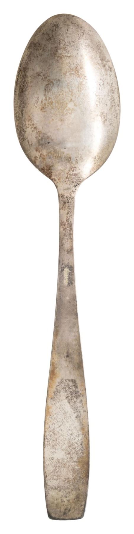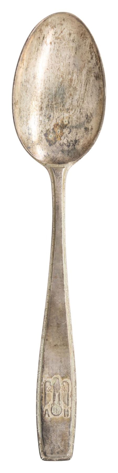 A fine original silver tablespoon for the formal silver service belonging to Adolf Hitler. The spoon measures just over 8 1/2" in length and shows an droop winged eagle with the initials "A" & "H" flanking it. The reverse is marked " (crescent moon) (crown) 800 (Prussian eagle) ". CONDITION: spoon has a pleasing tarnished finish with no damage. (02-25023-4/BF). $800-1200.