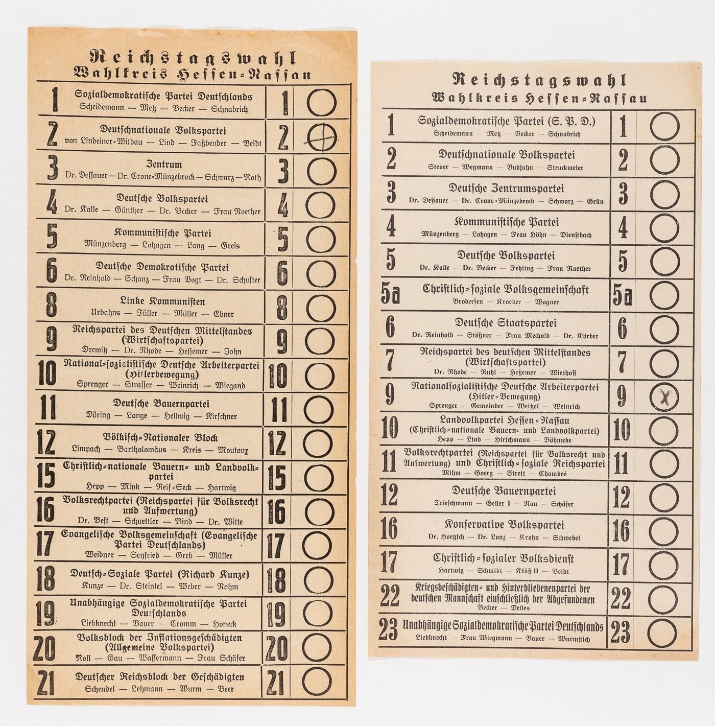 Two German Reichstags election ballots for the constituency 'Wahlkreis' of Hessen-Nassau (Hesse-Nassau) for the NSDAP listing candidates Adolf Hitler, Jakob Sprenger, Peter Gemeinder, Fritz Weitzel, Otto Strasser, Eduard Wiegand, and Karl Weinrich. Approx. 12 x 5.75 inches.