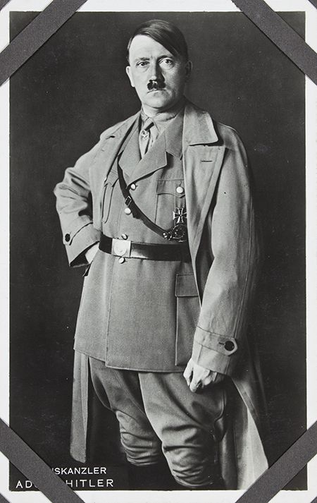 Superb photo album bearing over 40 period photo postcards of which all but two depict Adolf Hitler in a variety of poses, some casual, some in the most formal of settings. The images include many never before seen by us: Hitler at the French surrender, reviewing vessels of the Kriegsmarine, at the West Wall and in Poland greeting troops, with Mussolini at various functions and signings, and with the majority showing him warmly greeting young children. The postcards are all in very fine condition and unmounted.