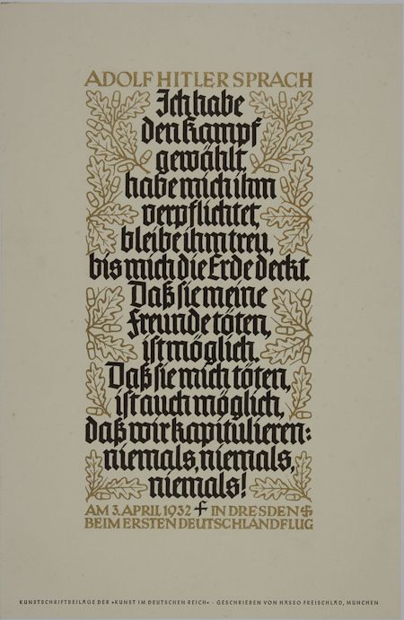 Printed quotation, a magazine supplement fancifully printed with a quote by Hitler made during his frantic "Germany First" flight around Germany in the hectic six days preceding the Apr. 10, 1938 elections. This quote was made by him at a stop in Dresden on April 3rd: "I chose the fight, I committed myself to it. I stay loyal until the soil covers me. My friends may get killed, I may also be killed. That we surrender: Never, Never, Never". Fine.