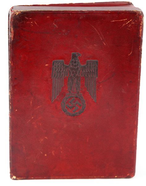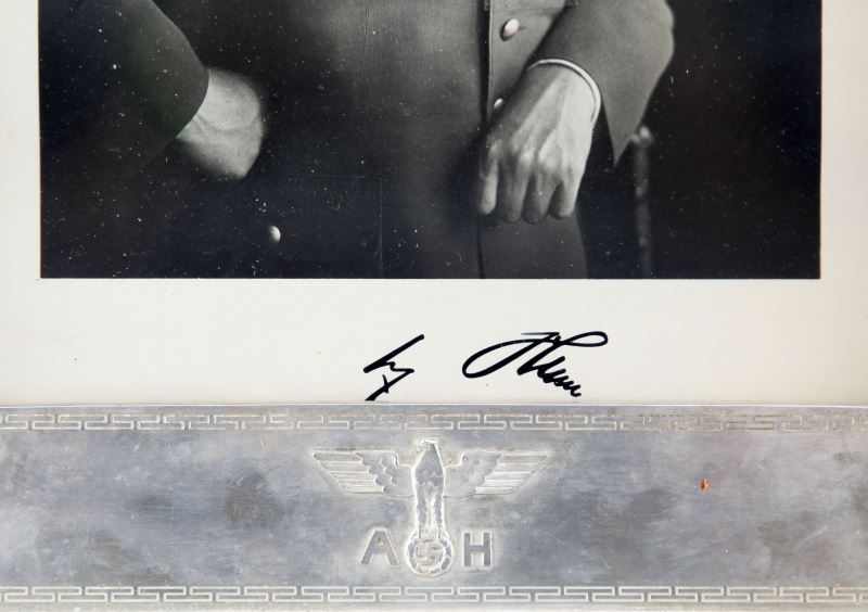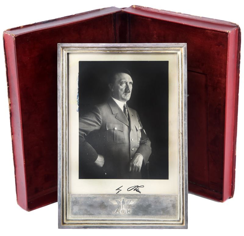 Picture measures approximately 8 by 10 inches, 10 by 14 framed. Frame is marked "FH/W, 925." Signed "Adolf Hitler" and kept within a maroon red case with a velvet lining. Picture has a tear to it's left center which has been repaired. Some scuffs around the border of the picture; overall in good to very good condition. This lot has a reserve.