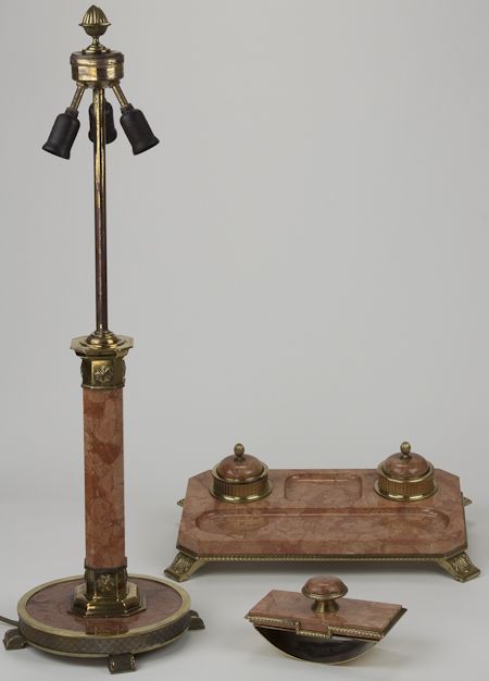An important relic from Adolf Hitler's Munich apartment, his matching marble and brass-plated desk set, blotter and table lamp, bearing a letter of provenance from the widow of Party Member No. 2, Hermann Esser. The desk set is comprised of a solid slab of white and rose-colored marble set atop four brass-plated feet which bear leaf designs. The center of the marble bears an indentation to hold the blotter, pens, etc. and is flanked by two 3" tall inkwells, each 3 1/4" diameter. The inkwells are encased in ribbed brass plate and topped by matching marble lids with plated handles. Overall dimensions 17 1/2" x 10 1/2" x 5 1/4". The blotter is of matching marble with brass plate trim marked with a crosshatched design on the handle and about the body of the blotter, dimensions 7 1/4" x 3 1/2" by 3 3/4" tall. Finally, the table lamp is of matching marble with crosshatched brass trim about the circular marble base which is supported by four metal feet. Squared-off marble extends halfway up the lamp to meet a brass neck, and brass trim bearing star designs is placed at the bottom and middle. The lamp accommodates three regular-sized bulbs and was re-wired at one point in time. Some plating has worn in places, else very good. These items are accompanied by a signed typed letter of provenance from ANNY ESSER (b. 1911), widow of HERMANN ESSER (1900-1981). Esser entered the Nazi party with Hitler in 1920, became the editor of the Nazi paper, Völkischer Beobachter, and was a Nazi member of the Reichstag. Esser was the party's first chief of propaganda, but was excluded from the party after the Beer Hall Putsch (1923). Her letter, written in German in Holzkirchen on May 19, 2011, reads in part: "...Herewith I Anny Esser, widow of the former State Minister Hermann Esser (Party Member No. 2) warrant that the desk set below [the desk set, blotter and lamp are pictured on the letter] made out of marble and brass belonged personally to Reichskanzler Adolf Hitler. The desk set was in his private apartment in Munich/Prinzregentenplatz. My husband and I were often guests of Adolf Hitler. At these meetings political matters were discussed and partially transcribed. On these occasions this desk set was used. I affirm that the apartment of Reichskanzler Adolf Hitler on Prinzregentenplatz was looted by the local population as well as the U.S. army. These statements I make to the best of my knowledge and with good conscience...". Hitler's apartment at Prinzregentenplatz 16, used by Hitler from 1929 until 1945, was a huge 300 sq. meters with nine rooms. Judging from its design, color, and construction, this particular set was likely located in a salon or living room, versus Hitler's utilitarian office, and was likely used only occasionally. Only a few photos exist of the interior of Hitler's apartment, so potential buyers have relied on letters of provenance from his maid Anny Winter or other reliable sources.