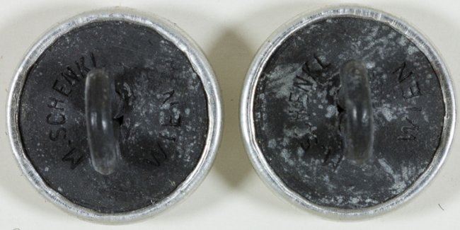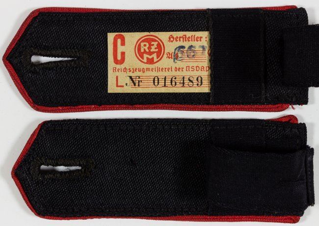 Pair of Hitler Youth ?Adolf Hitler Schule? shoulder straps, 4 1/8? x 1 ?? with red piping with original silver pebbled buttons, slip-on type with RZM tag affixed to the underside of one strap. Unissued, mint.
