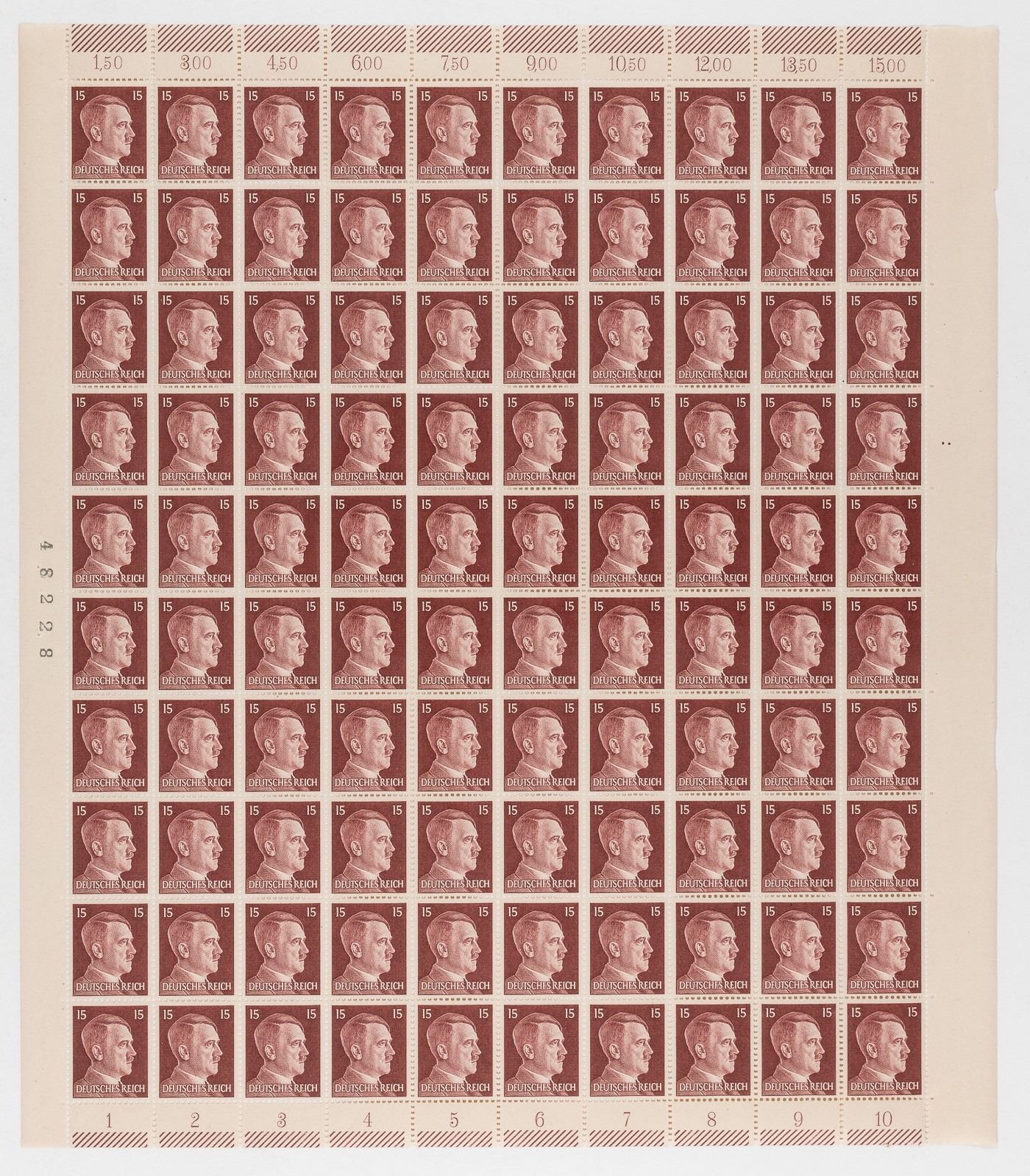 Full sheet of Adolf Hitler stamps of 15 Pfennig, 100 stamps.