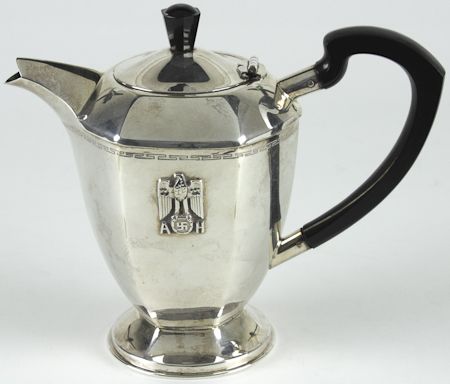 A rare Adolf Hitler relic, a silver teapot from one of his formal services, maker-marked by Bruckmann, .800, bearing a Greek key-bordered rim and embossed national eagle and swastika emblem above his initials "A H". The teapot measures 7" tall and 8 1/2" wide, from a collection of which part was sold at Sworders Auction, Sudbury, England, April 20, 2010. Fine condition. Hitler was an avid tea drinker, and rarely if ever drank coffee.