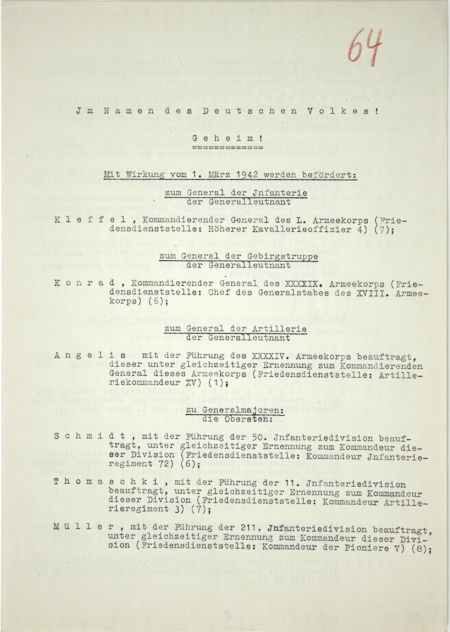 (1889 - 1945) Fuhrer of Germany and Nazi Party leader, Hitler's bloody rise to power, his military seizure of most of Europe and North Africa and his genocidal racial policies culminated in suicide in his Berlin bunker as Russian troops approached. Fine content D.S. as Furher, 3pp. 4to., "Fuhrerhauptquartier" Feb. 28, 1942 in which he promotes nineteen generals, an unusually large number, including ten Knight's Cross winners. Countersigned by WILHELM KEITEL (1882 - 1946), the promotions include Otto Fretter-Pico, Lieutenant General (Knight's Cross, 1942); Philipp Kleffel, Infantry General (Knight's Cross, 1942); Maximillian de Angelis, Artillery General, (Knight's Cross, 1942, with Oak Leaves, 1943); Siegfried Thomaschki, Major General (Knight's Cross, 1942, with Oak Leaves, 1943); Richard Muller, Lieutenant General and here promoted to Major General (Knight's Cross,1943); Werner Forst, Lieutenant General and here promoted to Major General (Knight's Cross, 1943); Heinrich Eberbach, Major General (Knight's Cross, 1943, with oak leaves 1944); Wilhelm Wetzel) Infantry General, (Knight's Cross, 1942); Kurt von der Chevallierie, Infantry General, (Knight's Cross, 1941, with oak leaves 1943); Ernst-Eberhard Hell, Artillery General, (Knight's Cross, 1943, with oak leaves 1942). Overall very fine condition.