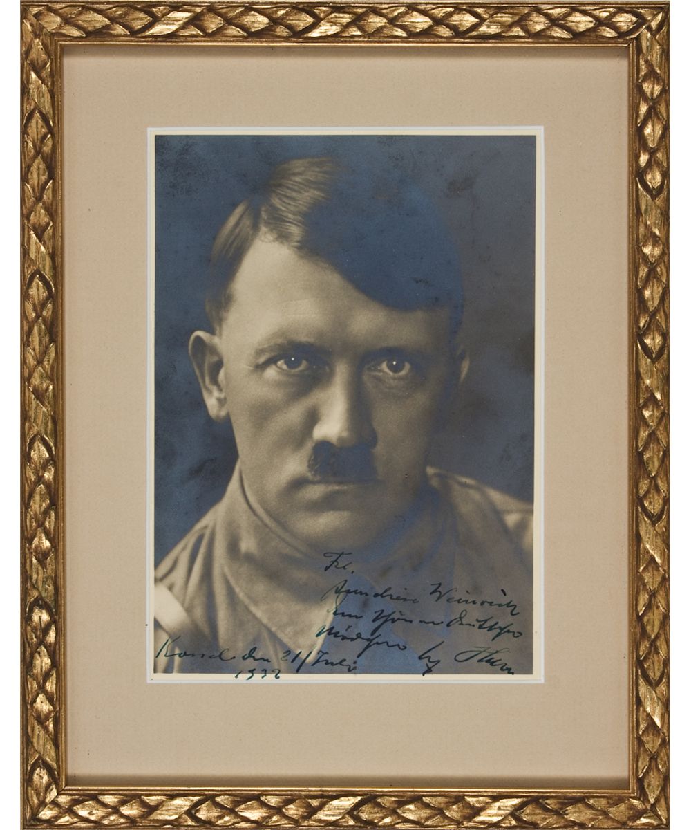 (1889 - 1945) Fuhrer of Germany and Nazi Party leader, Hitler's bloody rise to power, his military seizure of most of Europe and North Africa and his genocidal racial policies culminated in suicide in his Berlin bunker as Russian troops approached. Fine early I.S.P., 4 3/4" x 6 3/4" b/w, a stern chest-up pose in S.A. uniform, warmly inscribed to "Fraulein Anneliese Weinrich..." and dated July 21, 1932 to Kassel. Backstamp by Hoffmann. Slightly silvered, else fine condition. Framed. The recipient could very well have been the daughter of KARL WEINRICH (1887-1973), a member of the Reichstag for the electoral district of Hesse-Nassau and Gauleiter of Kurhessen.