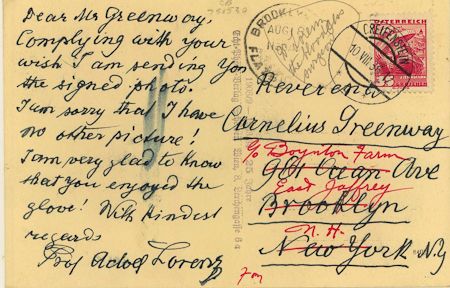 (1854 - 1946) German physician, an orthopedic pioneer and specialist. A.L.S. on the verso of a postcard picturing his chateau in Vienna, July 10, 1936 to noted collector Cornelius Greenway sending him a signed photo (not included), adding: "...I am sorry that I have no other picture! I am very glad to hear that you enjoyed the glove!...". Two words in text smeared, else very good.
