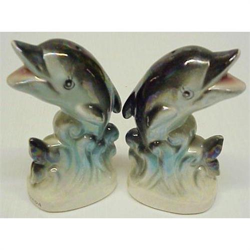 ADORABLE PAIR OF HAPPY LOOKING DOLPHINS , FIGURAL SALT AND PEPPER, STOPPERS ARE MISSING, EACH STANDS ABOUT 3 1/2" HIGH, US BUYER TO PAY 7.00 FOR SHIPPING PLUS INSURANCE.THANK YOU.