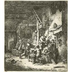 Die Familie.  Radierung 1647. B. 46, Dav. VI und G. VI (von VII). - Mit dem Namenszug und Datum in der Platte. Größe: 17,6 x 15,8 cm. Ca. 5-10 mm breites Rändchen minimal stockfleckig und mit leichten Knickspuren. Verso stellenweise mit leichten Kleberesten. Guter, gleichmäßiger Abdruck mit den noch schwach sichtbaren Horizontalen in den Stufen der Wendeltreppe.