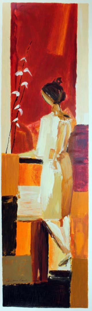 Artist: Adriana Naveh Title: Elegance Medium: Serigraph on Fine Art Paper Signature: Hand-signed by the Artist Limited Edition: 375 Image Size: Approximately 39 inches x 11 inches Framed: Unframed Details: This work comes with a Certificate of Authenticity Adriana Naveh's women images are symbolic of the love and passion she feels toward her environment as she inspires the onlooker to visualize the Beauty of Womanhood. With the use of an interesting medium, plaster speckle and large open spaces Naveh gives new meaning to simplicity in composition. A background of household artifacts highlights women engrossed in thought, caught in a simple soft pose. The intimate subjects are inspired by everyday life.