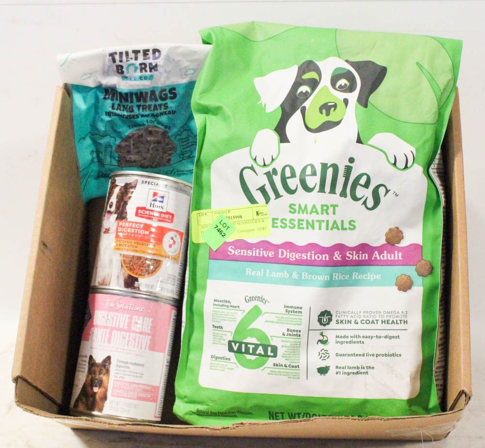SAMPLE PACK- 5.5LB GREENIES LAMB & BROWN RICE (JUN 24 2025) + 362G CAN HILL'S SCIENCE DIET CHICKEN VEG RICE STEW (NOV 2026) + 354G CAN BLUE BUFFALO DIGESTIVE CARE(NOV 2025)