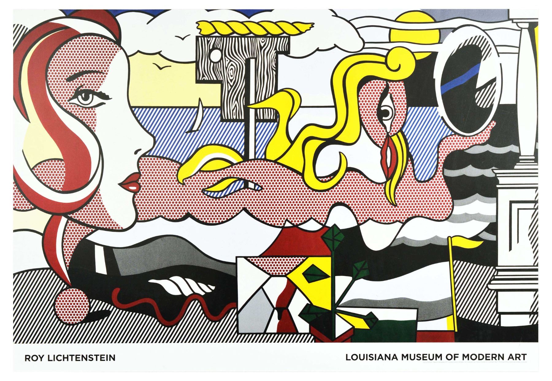 Original vintage exhibition poster for an exhibition of Roy Lichtenstein work at the Louisiana Museum of Modern Art in Copenhagen. The poster features Lichtensteins eye-catching pop art painting Figures in Landscape (1977) which shows a red-haired woman in profile in front of a highly patterned composition of shapes, fragments of a womans face, a column, shells and a sailing boat on the sea. Horizontal. Excellent condition. Country of issue: Denmark, designer: Roy Lichtenstein, size (cm): 70x100, year of printing: 2003