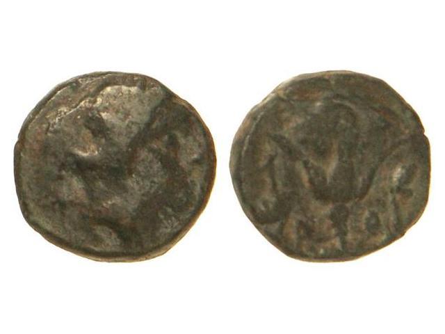 AE 11. - 304 a.C. - RODAS. - Anv.: Cabeza a derecha. Rev.: Rosa, alrededor letras y símbolos. 1,50 grs. AE. Pátina verde. Se-5072 var. MBC-/MBC. - -