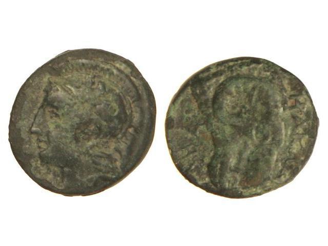 AE 13. Siglo IV a.C. KLAZOMENAI. Anv.: Cabeza de Atenea con casco crestado a izquierda. Rev.: Cabeza de Carnero a derecha, encima y debajo leyenda. 1,60 grs. Se-4322 sim. MBC+.