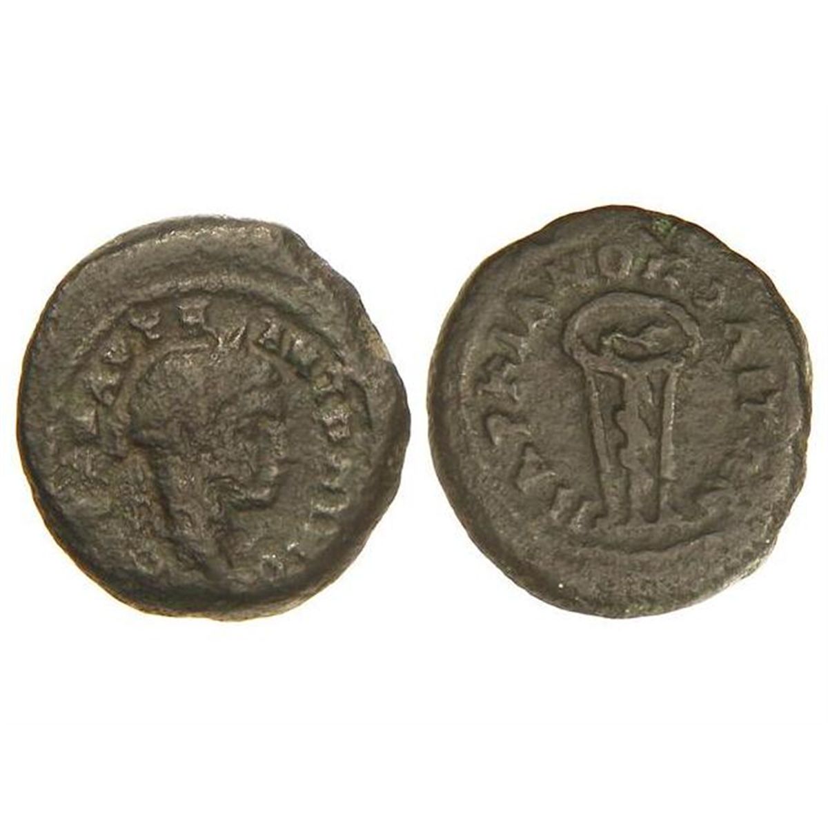 AE 15. - 211-217 d.C. - CARACALLA. - MARCIANOPOLIS. - Anv.: Cabeza laureada a derecha, alrededor leyenda. Rev.: Altar en forma de trípode con serpiente enrollada en su base, alrededor leyenda. 4,70 grs. AE-. Pátina oscura. MBC. - -