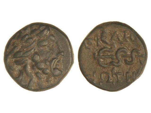 AE 15. Siglo II-I a.C. PÉRGAMO. Anv.: Cabeza de Asclepio a derecha. Rev.: Serpiente enrollada en bastón de Asclepio, alrededor (A)¶(¶) ¶(¶). 4,40 grs. Se-3968 sim. BMC+.