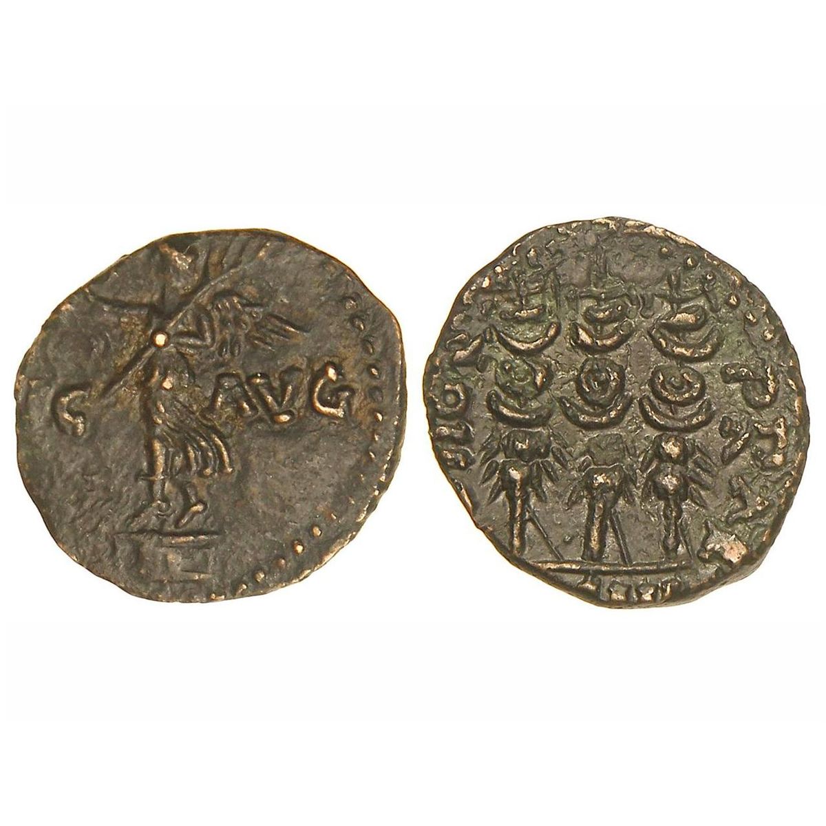 AE 19. - 27 a.C.-14 d.C. - AUGUSTO. - FILIPI. MACEDONIA. - Anv.: (VI)C. AVG. Victoria a izquierda. Rev.: Tres estandartes, alrededor leyenda. 2,60 grs. AE. GIC-32. MBC. - -