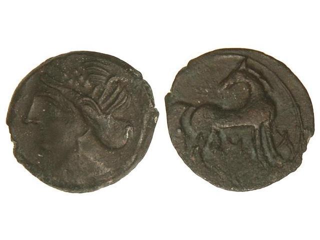 AE 21. - 221-210 a.C. - ZEUGITANIA. CARTAGO. - Anv.: Cabeza de Tanit a izquierda. Rev.: Caballo a derecha con la cabeza vuelta, entre las patas letras púnicas. 4,40 grs. AE. Pátina negra. SNG-317 var. (MBC+). - -
