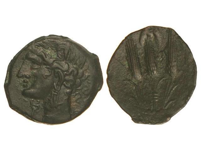 AE 21. - 241-238 a.C. - ZEUGITANIA. CARTAGO. - Anv.: Cabeza de Tanit a izquierda. Rev.: Tres espigas, encima creciente. 4,60 grs. AE. Pátina negra. SNG-246. EBC-. - -