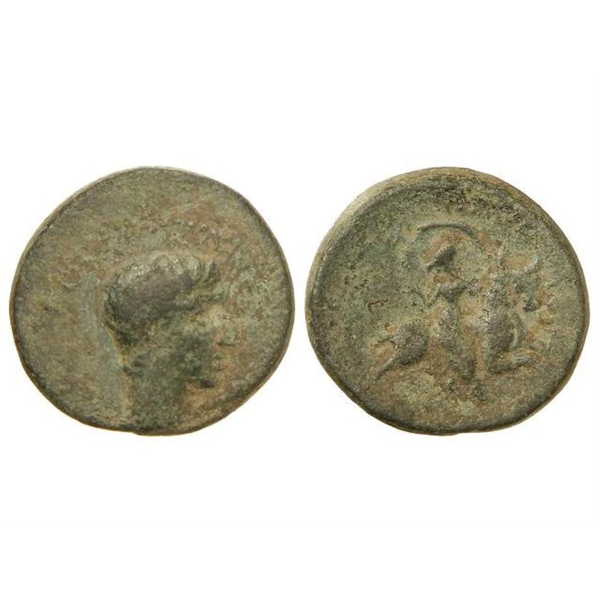 AE 22. - 27 a.C.-14 d.C. - AUGUSTO. - ANFIPOLIS. MACEDONIA. - Anv.: Cabeza descubierta a derecha, alrededor leyenda. Rev.: Rapto de Europa a derecha. 8,20 grs. AE. Pátina verde. BMC-73; GIC-29 sim. MBC-. - -