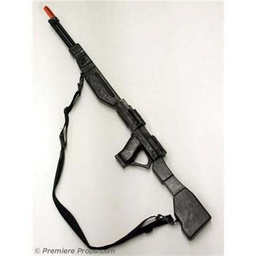 AEON FLUX - The guard rifle movie prop (measures 38.25" x 5.75" x 2.25") is a slender shoulder slung weapon with nylon strap. This futuristic rifle prop is fake cannot be made to fire in any way. It is constructed of hard resin and rubber.